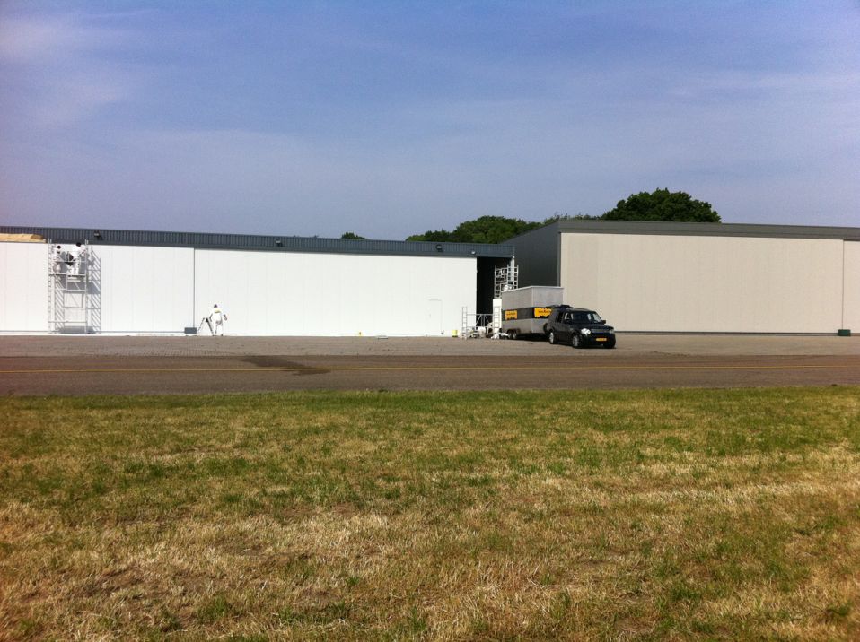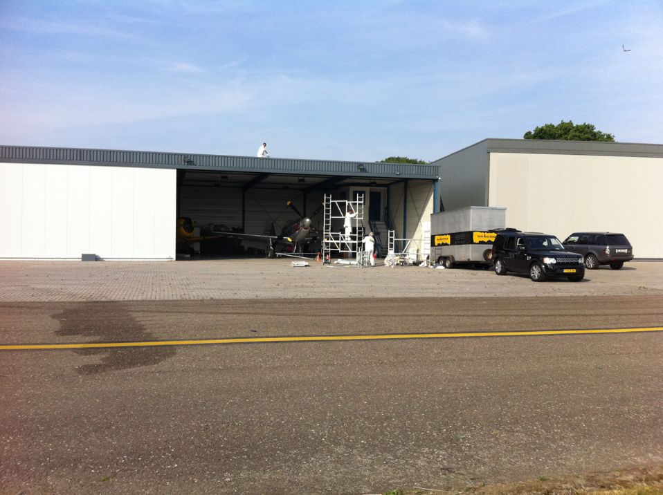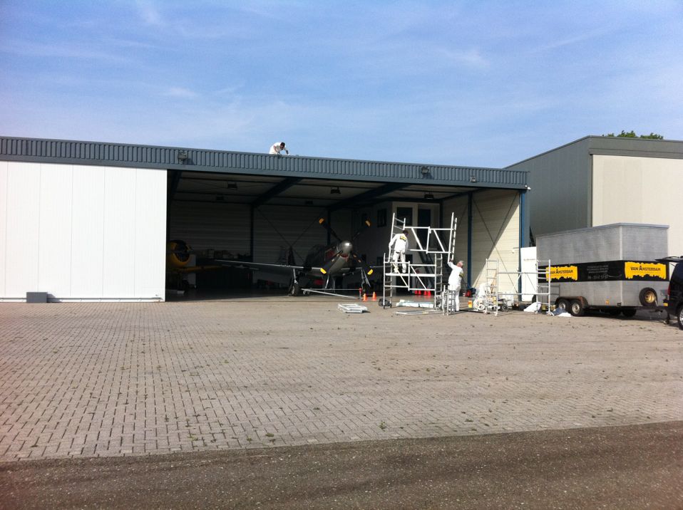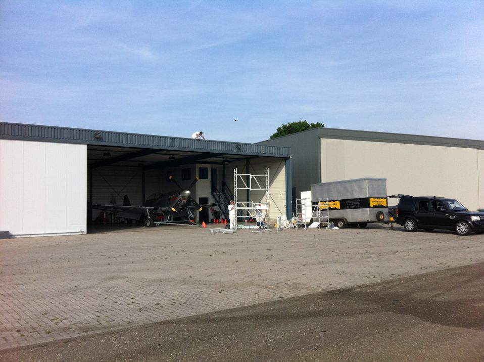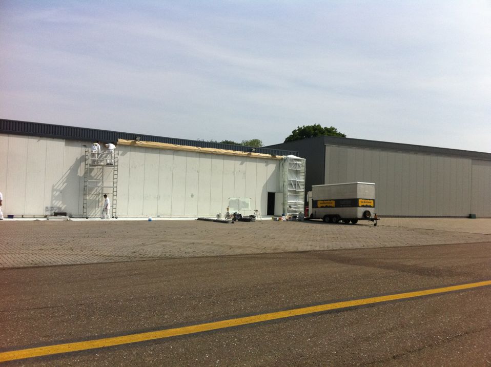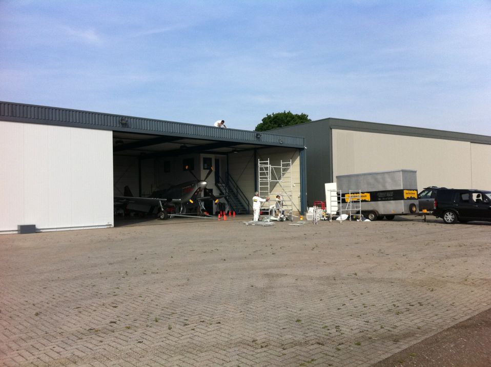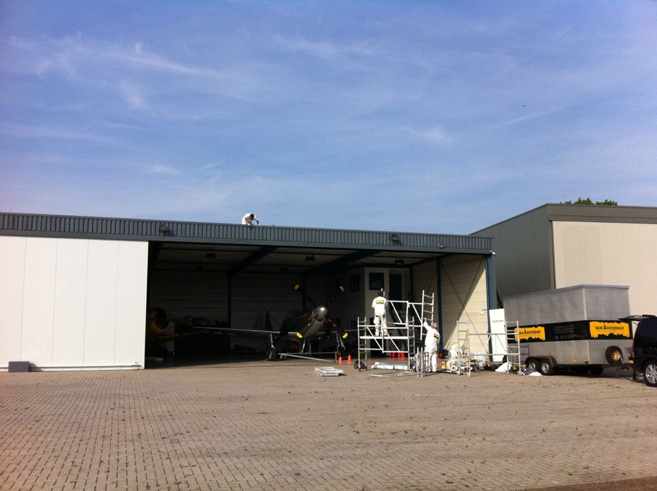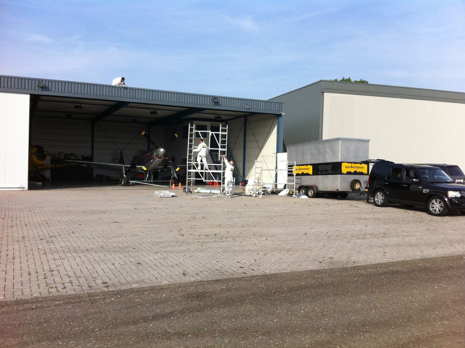 In Belgie werden wij gevraagd door een verzamelaar van historische vliegtuigen om de zojuist aangeschafte prive hangar te spuiten. Grootste probleem wat zich hier kon voordoen was verfnevel op onbetaalbare vliegtuigen.